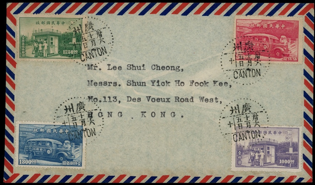 1947年廣州寄香港實寄封1件,貼郵車郵亭特種郵票1套,銷廣州11月5日戳,保存完好,為郵車郵亭郵票自然首日封