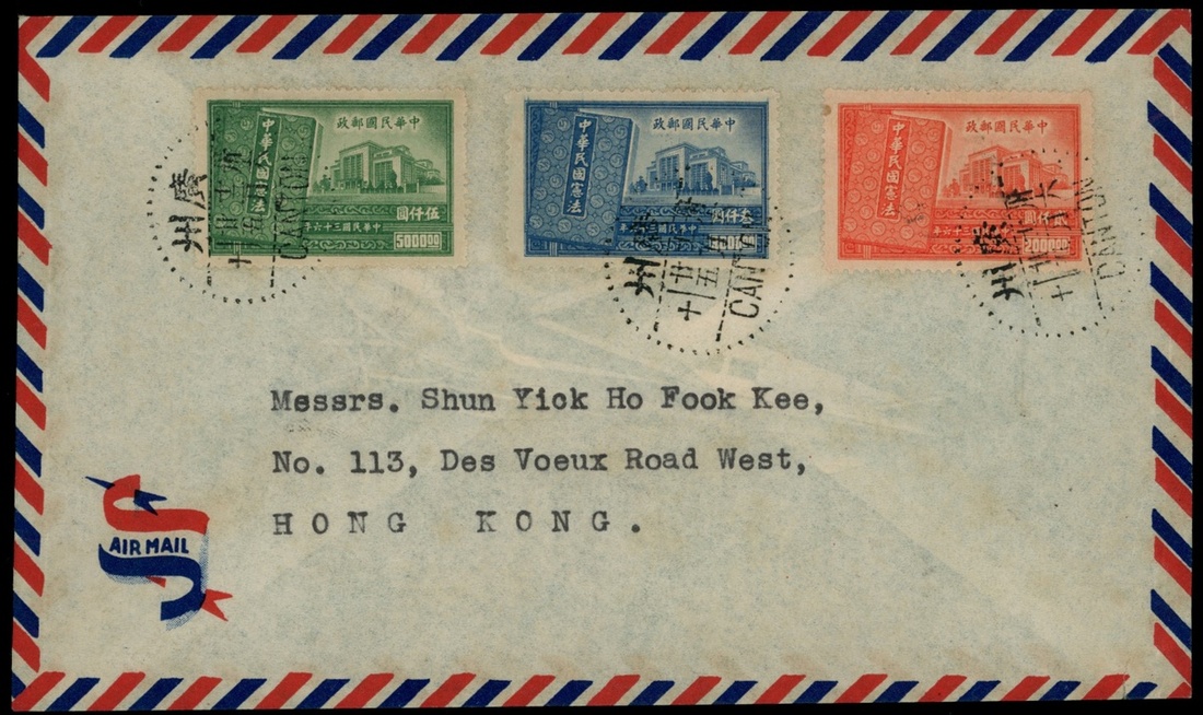 1947 (25 Dec.) Construction $2000-$5000 set of three, first day cover to Hong Kong tied by Canton c.d.s., fine.