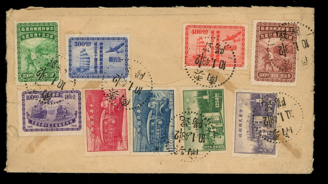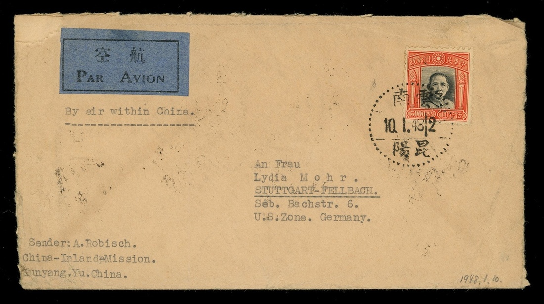 Mobile Office: 1948 (10 Jan.) air mail envelope to Germany bearing set of Mobile Post Office and General Post Office, Sun Yat Sen Fourth London Print $5000 tied by Kunyang c.d.s.