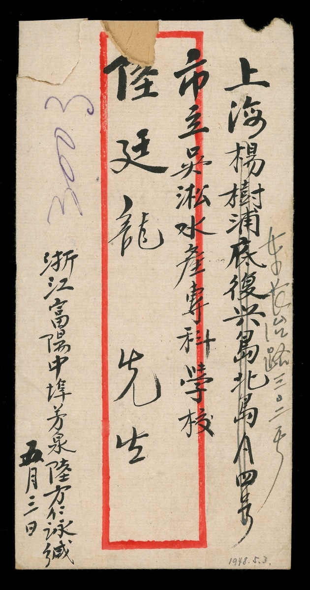 1948 (3 May) envelope to Shanghai bearing $2000 on $3 pair and $7000 strip of three tied by Fuyang c.d.s., Shanghai (5.4) arrival c.d.s. Pays $25,000. Photo