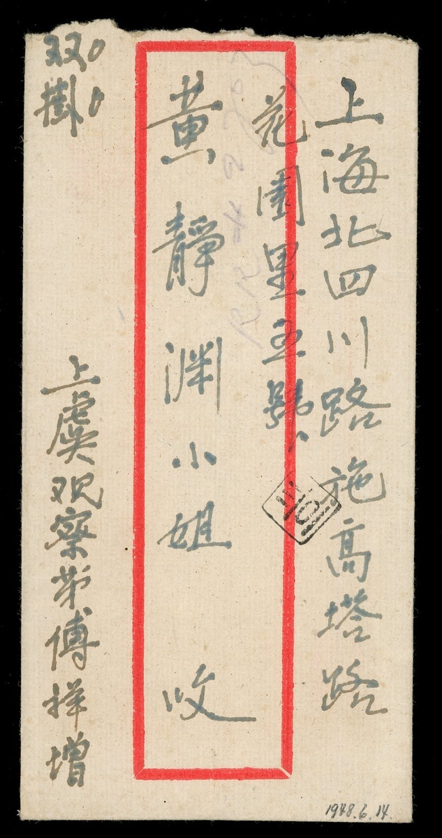 1948 (14 Jun.) double registered envelope to Shanghai bearing $2000 on $3, $3000 on $3 and $20000 tied by Shangyu c.d.s., Shanghai (6.19) arrival c.d.s. Pays $25,000. Photo