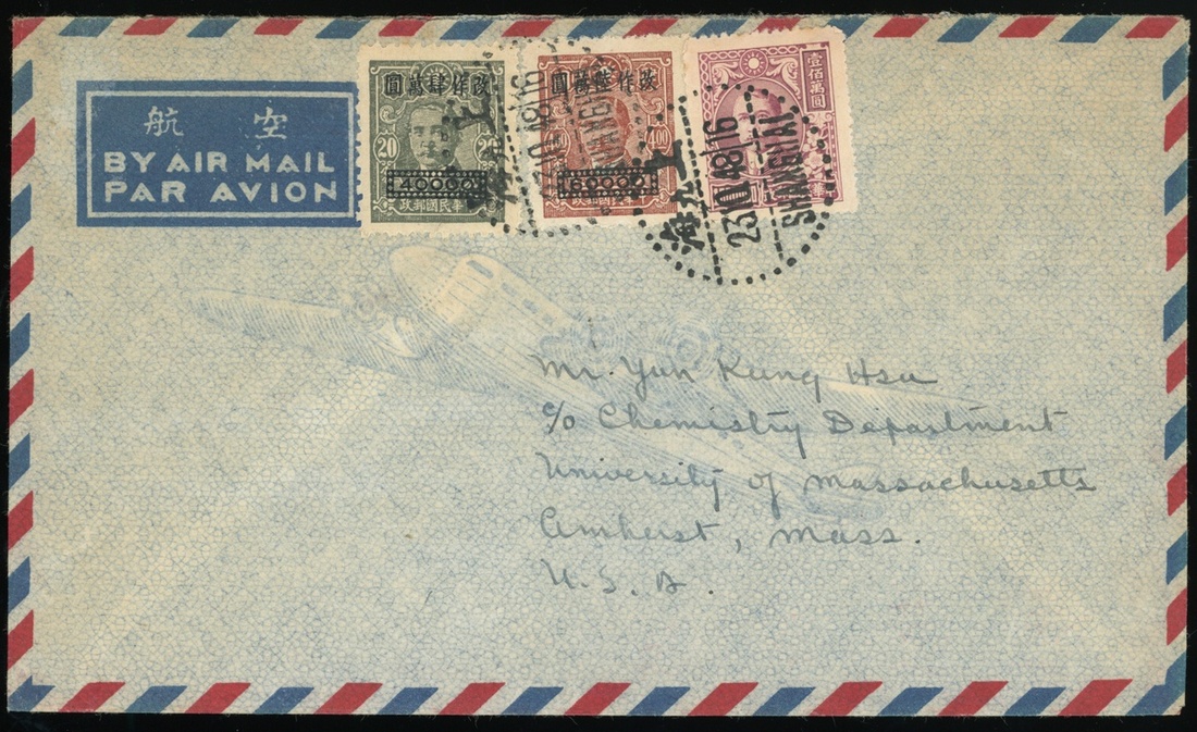 1948 (23 Oct.) airmail to U.S.A. bearing on front Dr.S.Y.S. Central Trust Perf.11 $40000 on 20c., Central Trust $60000 on $4 and Dah Tung Print $1000000 cancelled by Shanghai bilingual c.d.s., scarce perf. variety used on cover, fine.