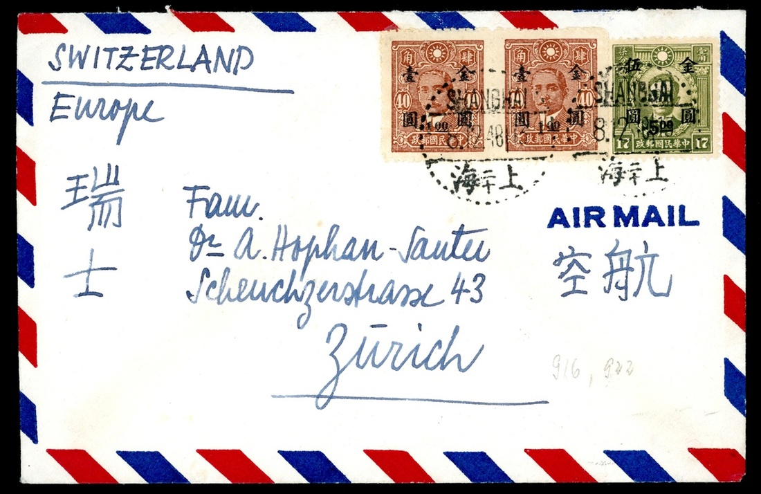 1948 (8 Dec.) airmail envelope to Switzerland bearing Gold Yuan $1 on 40c. horizontal pair and $5 on 17c. cancelled by Shanghai bilingual dotted rim c.d.s., fine.