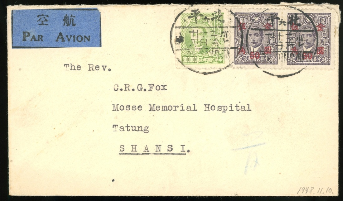 1948 (10 Dec.) an envelope, bearing CNC SYS $30000 and G.Y.50c on &7 in pair, tied by Peiping c.d.s., fine.