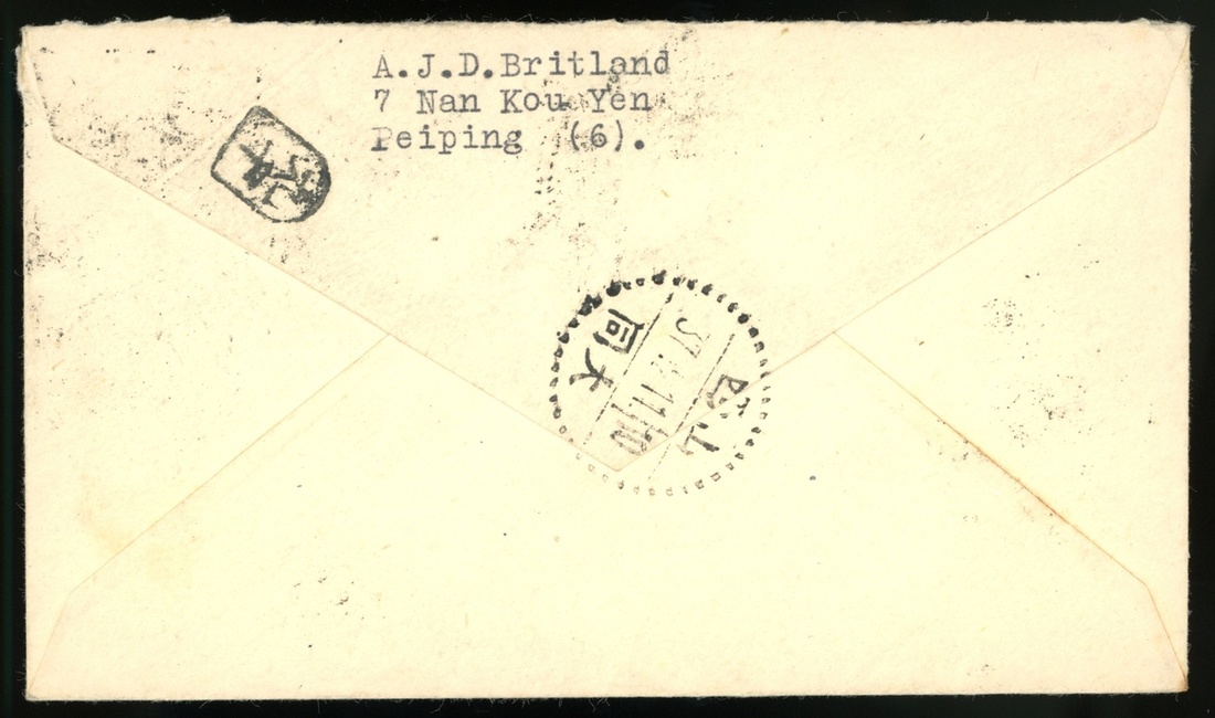 1948年北平寄大同航空封1件,貼上海大東三版孫像30萬元1枚,孫像加蓋金元50分2枚,銷北平12月10日戳,有山西大同11日到達戳,保存完好