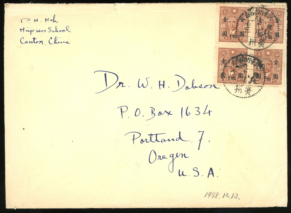 1948年廣州寄美國實寄封1件,貼孫像加蓋金元1元四方連,銷廣州汽車行動郵局A1,12月13日戳,郵戳清晰,保存完好