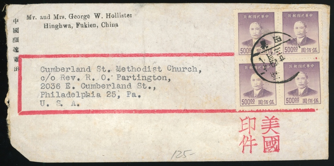 1949年福建莆田寄美國印刷品封1件,貼上海大東一版孫像金元500元四方連,稅改金元100元3枚,銷福建莆田4月23日戳,保存完好