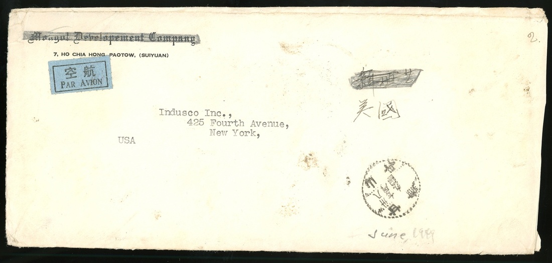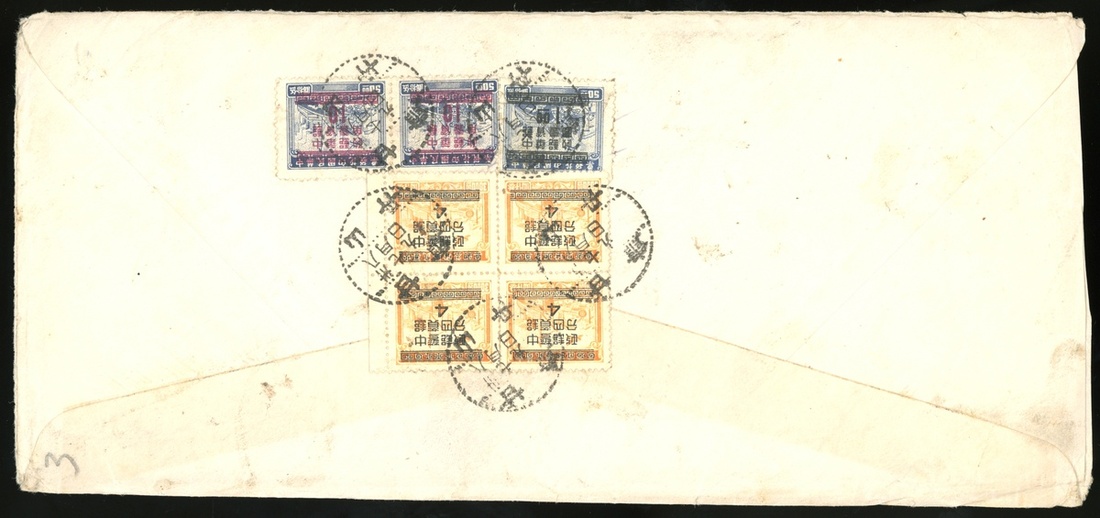 1949 (9 July) a SY envelope air mail to USA, bearing SY on revenue stamps,4c on $3000 block of 4, 10c on $50 in pair and $1 $50, tied by Shandan c.d.s.