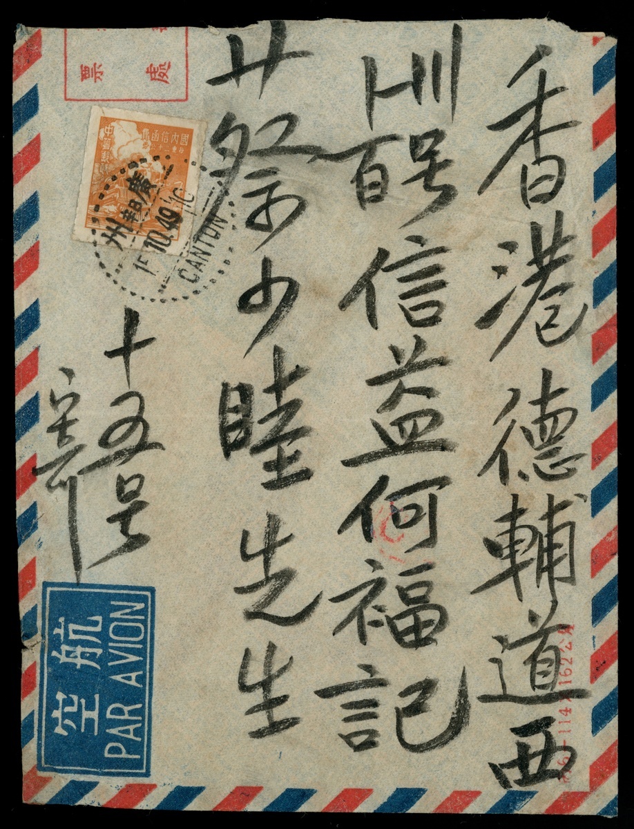 1949年廣州寄香港實寄封1件,貼香港亞洲版國內信函費單位郵票1枚,銷廣州10月15日戳,保存完好,另附當年10月15日《成報》剪報1件,內容為共軍凌晨開入廣州國共今午交接政權新聞,此封為解放軍進入廣州後首日通信實例