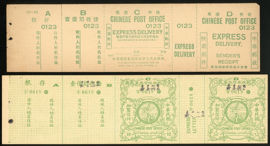 民國郵政快信票橫連全張2件不同,未使用,保存完好