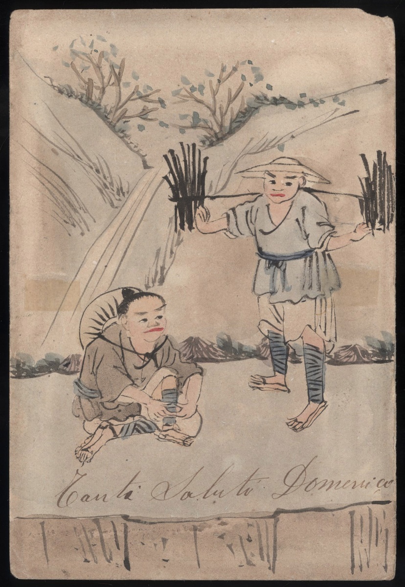 1897年清一次郵資片1件,未實寄,背手繪耕樵夫圖,繪製精美,保存完好