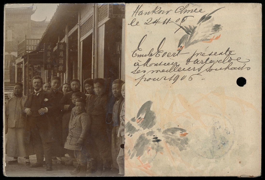 1905年漢口寄比利時清一次郵資片1件,加貼倫敦版蟠龍1分1枚,2分4枚,銷漢口11月23日小圓戳,經上海中轉,又上海英國客郵局戳,片背貼蛋白照片1枚,內容為洋人與中國平民合影,空白處手繪花鳥圖,片上部又一處裝訂孔,整體保存完好