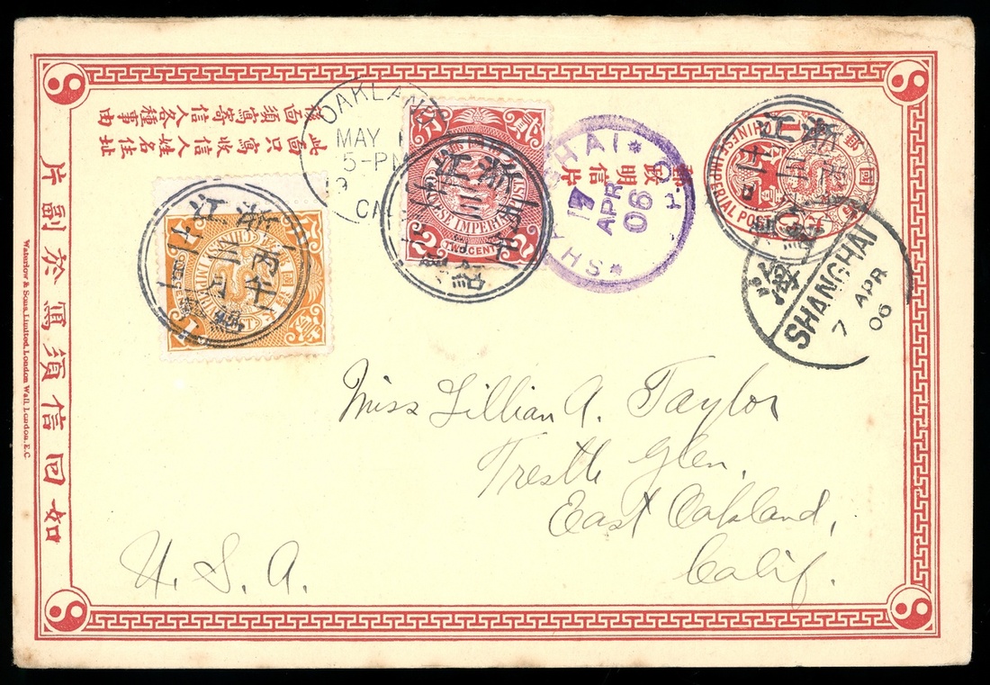 1906 (4 Apr.) second issue Coiling Dragon postcard to U.S.A. cancelled by fine strikes of Chekiang c.d.s. in purple, with Shanghai bilingual c.d.s., Japanese post Office Shanghai c.d.s. in purple and Oakland arrival c.d.s.; fine