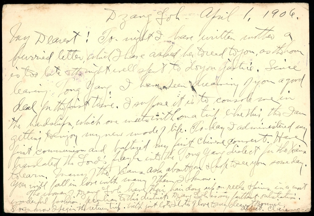 1906年浙江紹興寄美國清二次郵資雙片之去片1件,加貼倫敦版蟠龍1分2分各一枚,銷浙江紹興丙午三月十一日雙圈三格干支戳,經上海中轉,有上海4月7日小圓戳,上海日本客郵局同日戳,郵戳清晰,保存完好