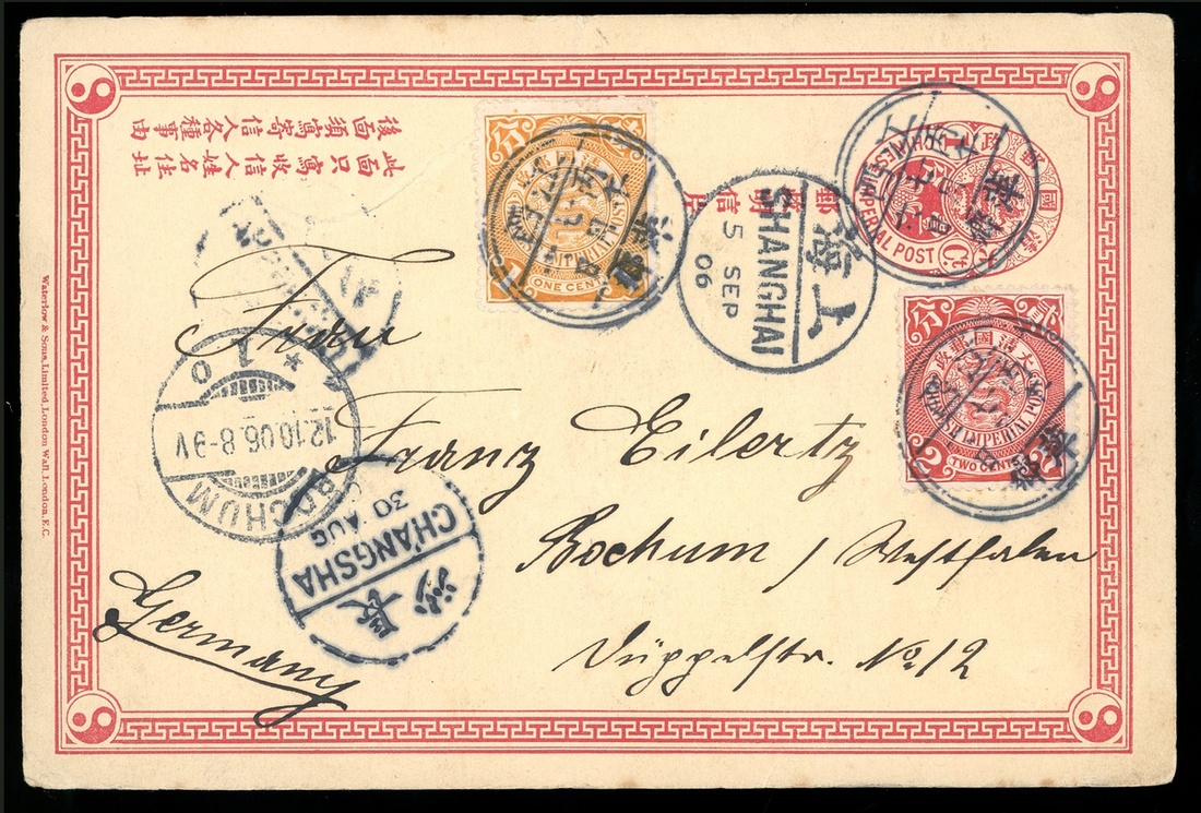 1906 (25 Aug.) second issue Coiling Dragon 1c. card from Pingsiang to Germany, uprated C.I.P. 1c. and 2c. tied by fine strikes of Pingsiang, Kiangsi c.d.s., with Changsha (30.8) and Shanghai (5.9) and Bochum arrival (12.10); fine. The reverse with handpainted illustration of Chinese ladies taking tea