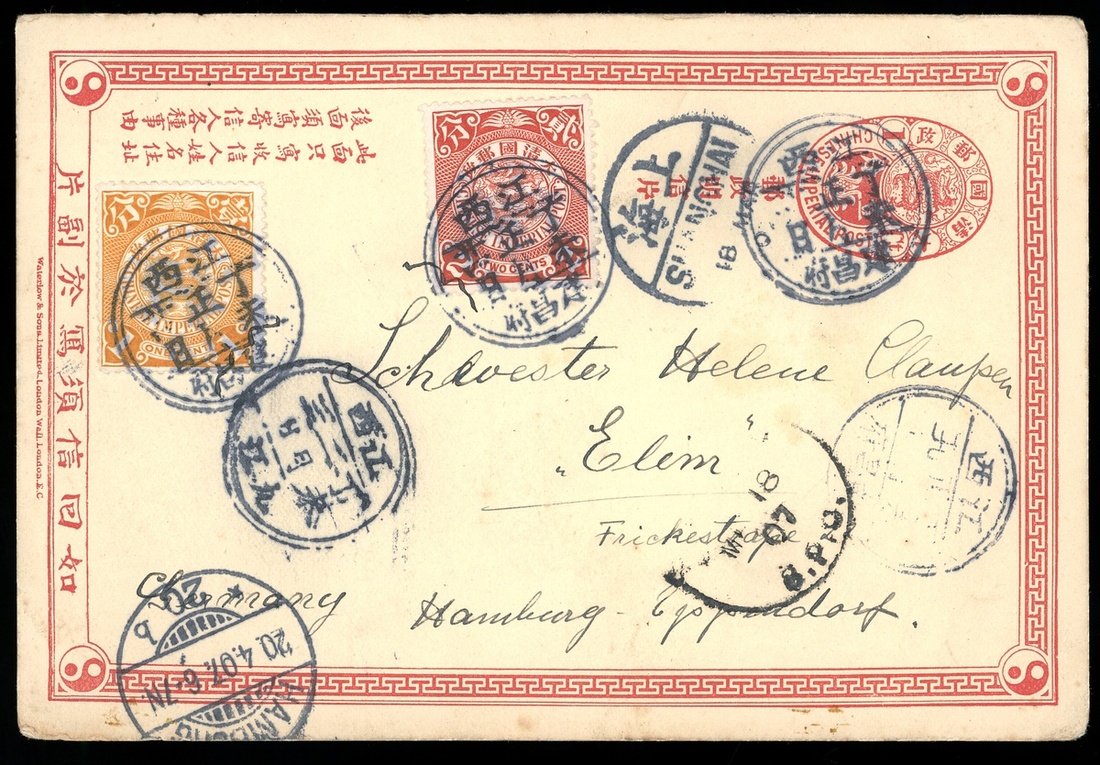1907 (8 Mar.) second issue Coiling Dragon 1c. card from Kienchangfu to Germany, uprated C.I.P. 1c. and 2c. cancelled by Kienchangfu, Kiangsi c.d.s., with Shanghai Chinese and British (18.3) c.d.s. and Hamburg arrival (20.4), good to fine