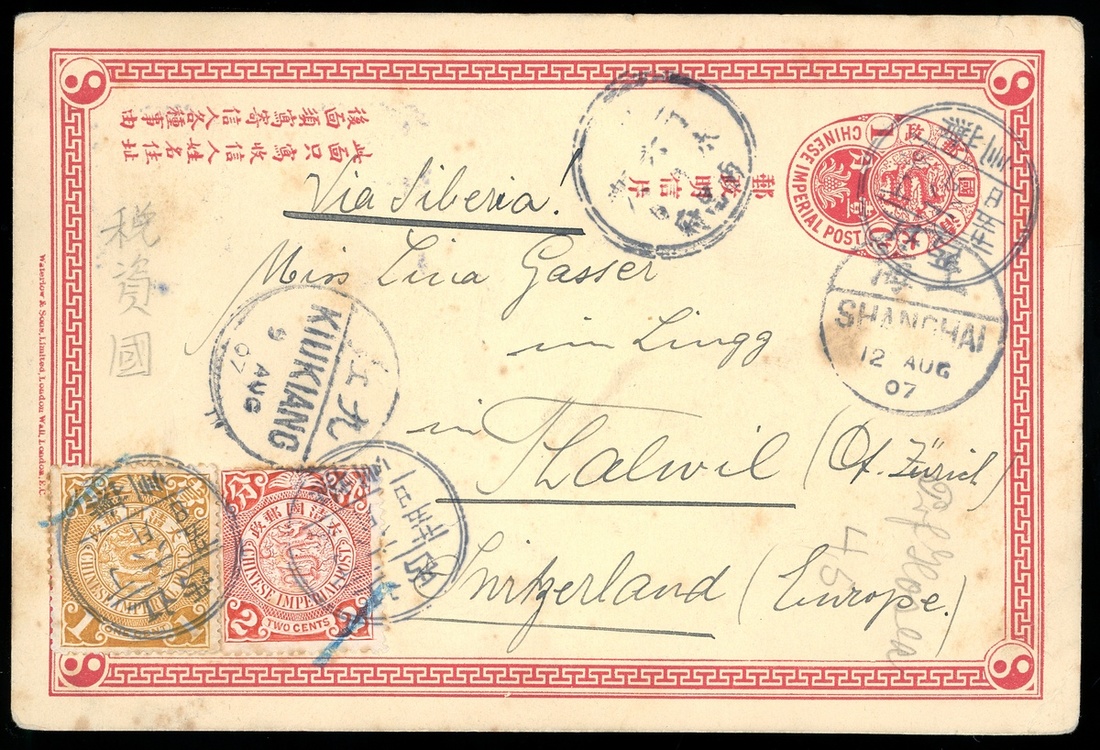 1907 (3 Aug.) second issue Coiling Dragon 1c. card from Fuchow to Switzerland, uprated C.I.P. 1c. and 2c. tied by Fuchow, Kiangsi c.d.s. with Kiukiang (9.8) and Shanghai (12.8) bilingual c.d.s.