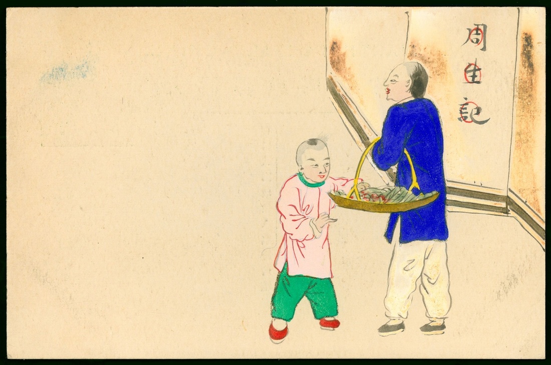 1908年清第四次郵資片1件,未使用,背手繪提籃賣圓形圖。繪製精美,保存完好