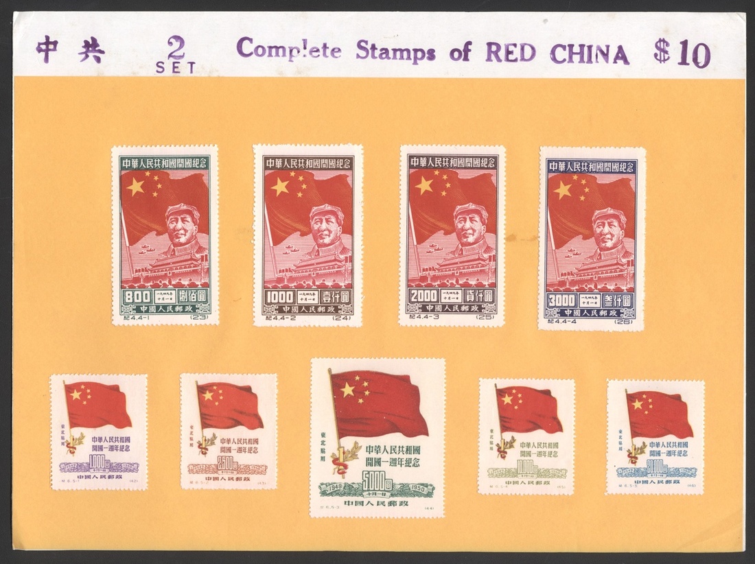 1950 (1 Jul.) Inauguration of Chinese People's Republic (C4) $800 to 3000 complete set of four and (1 Oct.) First Anniv. of People's Republic (C6) $100 to $20000 in complete set of five, all mounted on page, fine, unaddressed. Yang C23-C26, C37-C41