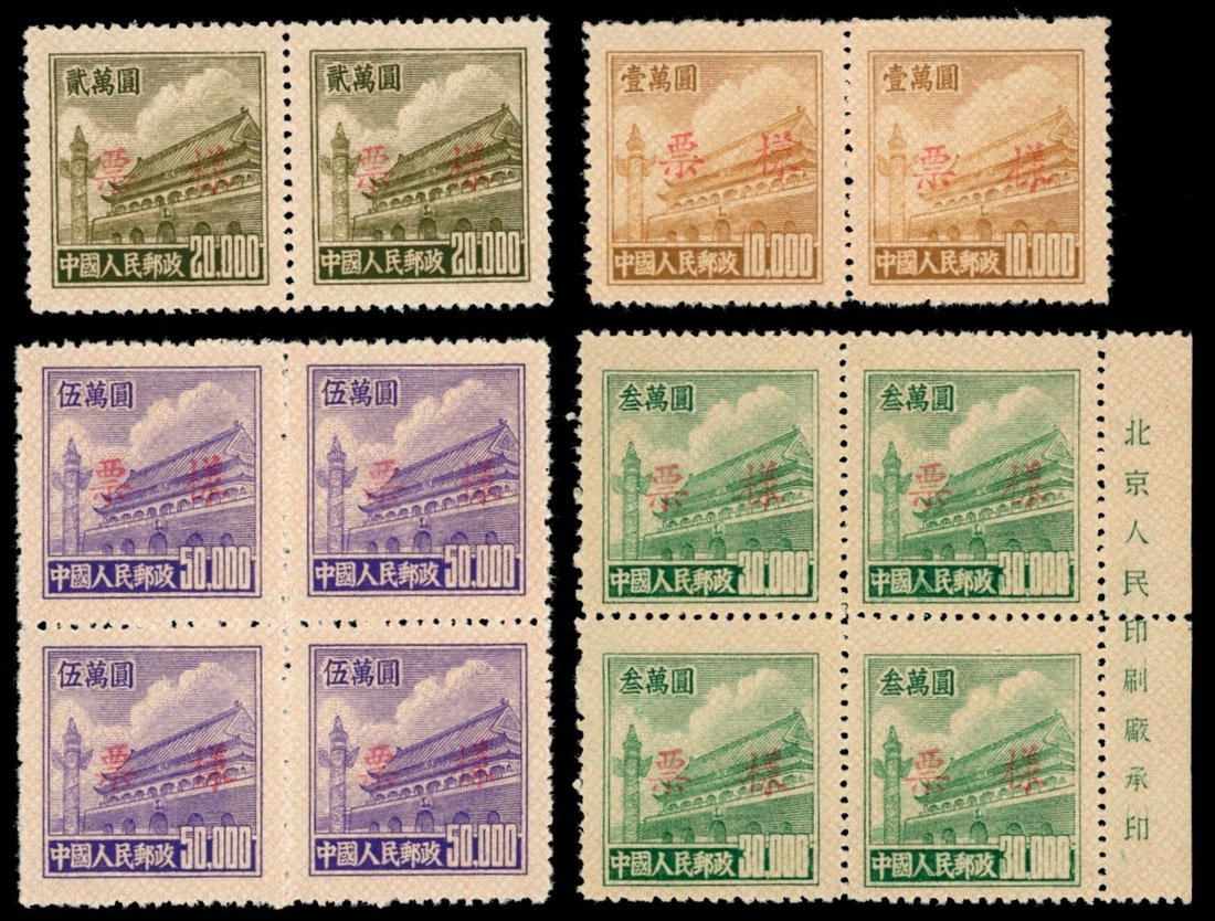 1951年普5郵票加蓋樣票一組,包括1萬元橫雙連1件,2萬元橫雙連1件,3萬元四方連1件(帶右邊廠銘),5萬元四方連1件,均加蓋紅色樣票字樣,其加蓋真偽自辯,郵票票面顏色鮮豔,齒孔完整,5萬元新票市場價值較高
