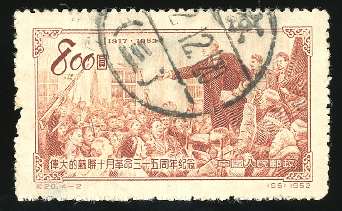1952 (7 Nov.) C20 35th Anniversary of Russian Revolution $800 (2) Lenin addressing revolutionaries, used with part of Beijing c.d.s., small thin and few short perf. otherwise very fine. Yang C95