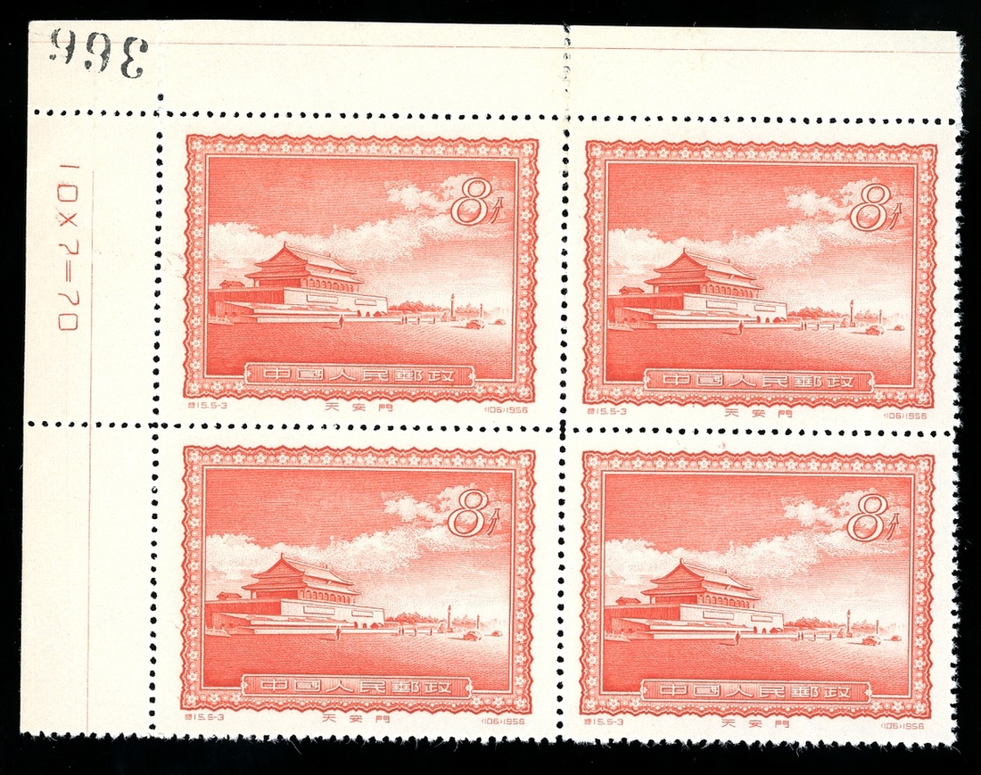 1956 (15 Jun.) S15 Views of Peking, set of five, block of four with top left margin, unused, very fine.