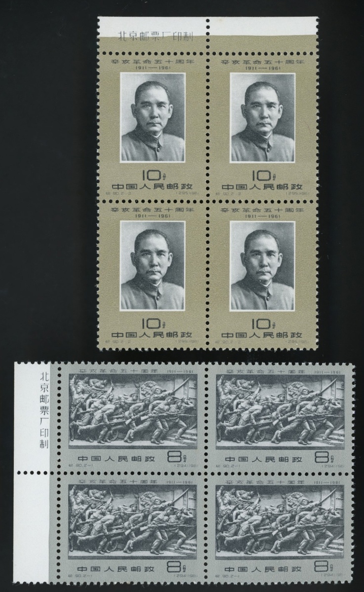 1961年紀90辛亥革命新票四方連1套,均帶廠銘邊紙,票面顏色鮮豔,齒孔完整,原膠,背膠較乾,局部稍有黃斑,上中品