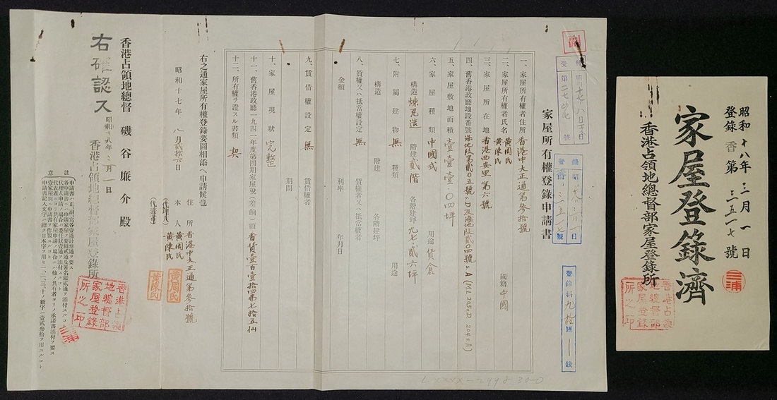1943年(昭和十八年) 日本佔領香港時代家屋所有權登錄申請書一份, 經"香港佔領地總督部家登錄所蓋章核實申請, 並附一枚罕見的登錄濟 (收據).