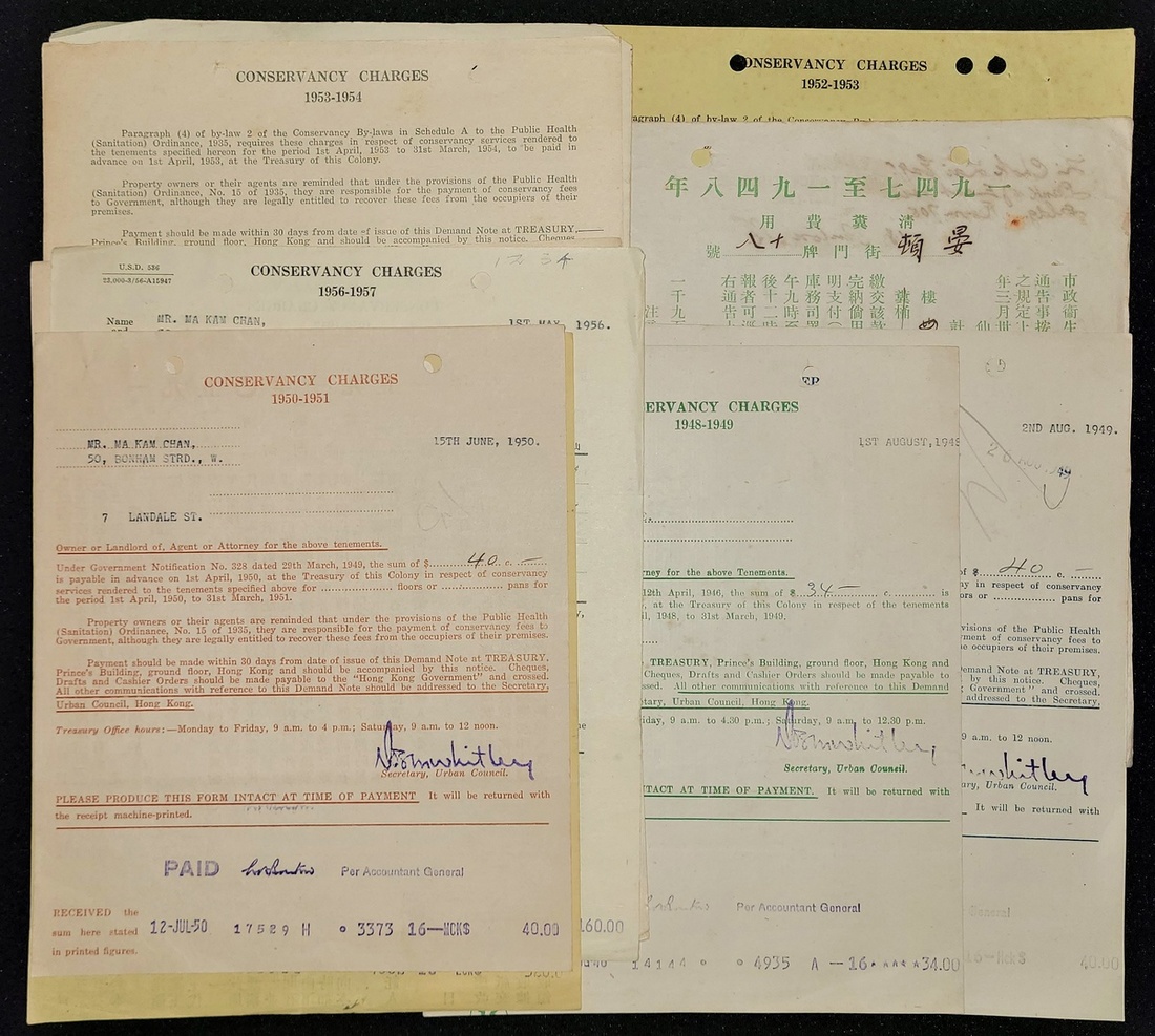 1947-1956 ten copies of the Hong Kong government's Conservancy Charges bills. The heads of households are celebrities Ma Kan Chuan and Bank of East Asia Taipan.