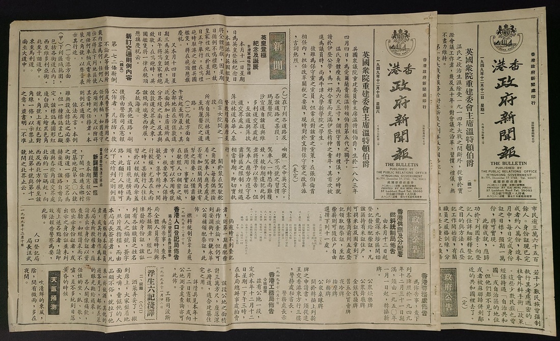 1949年12月香港政府新聞報两份, 分別是No.330及331號. 為早年香港政府向市民發放政府的施政消息或交通安排的公報.