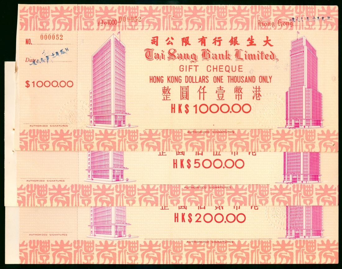 1960s Hong Kong Tai Sang Bank gift Cheque of $1,000, $500 and $200 each, none of which were with authorized signed.