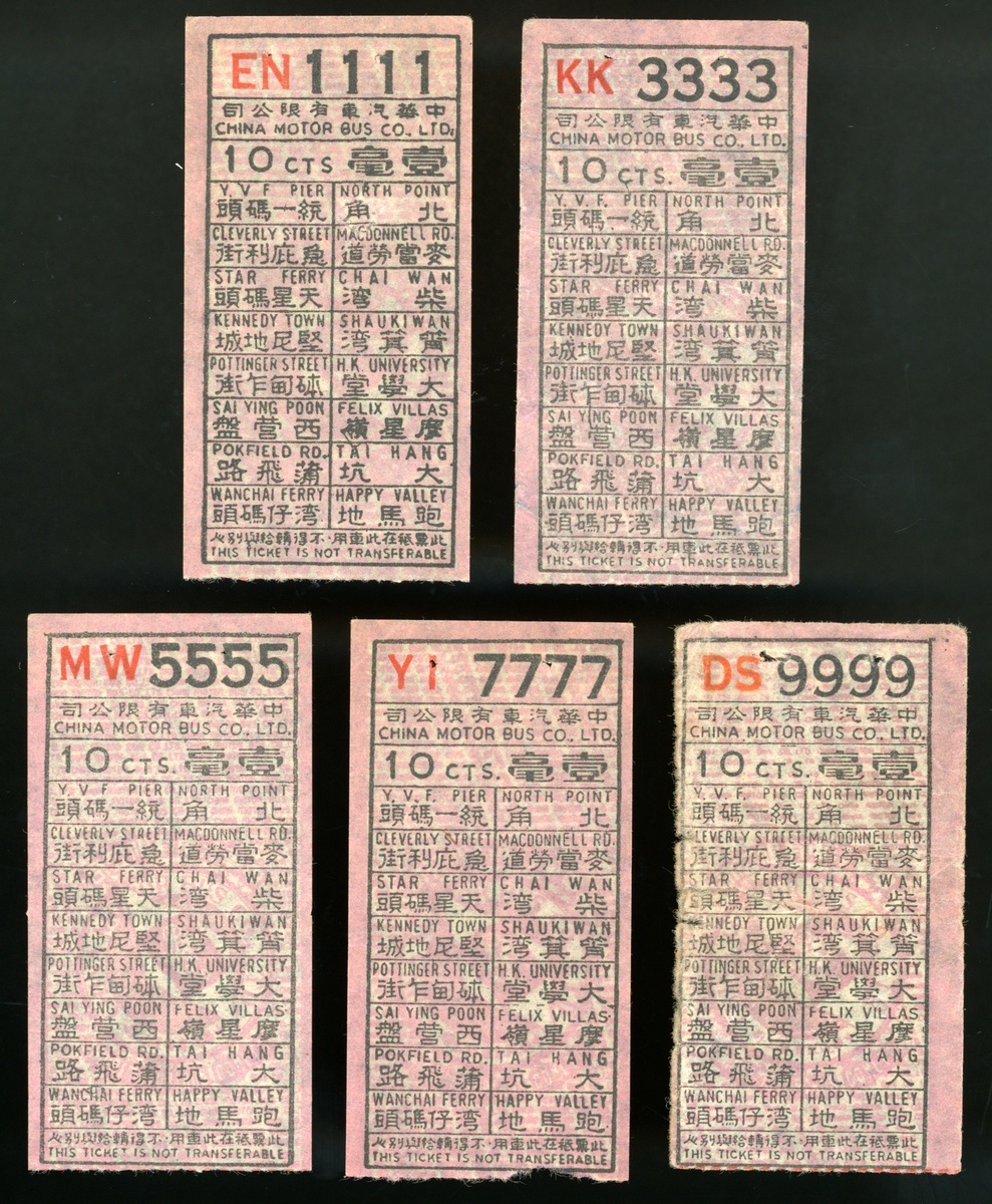 1970s five pcs. lucky number tickets of Hong Kong China Motor Bus Company.