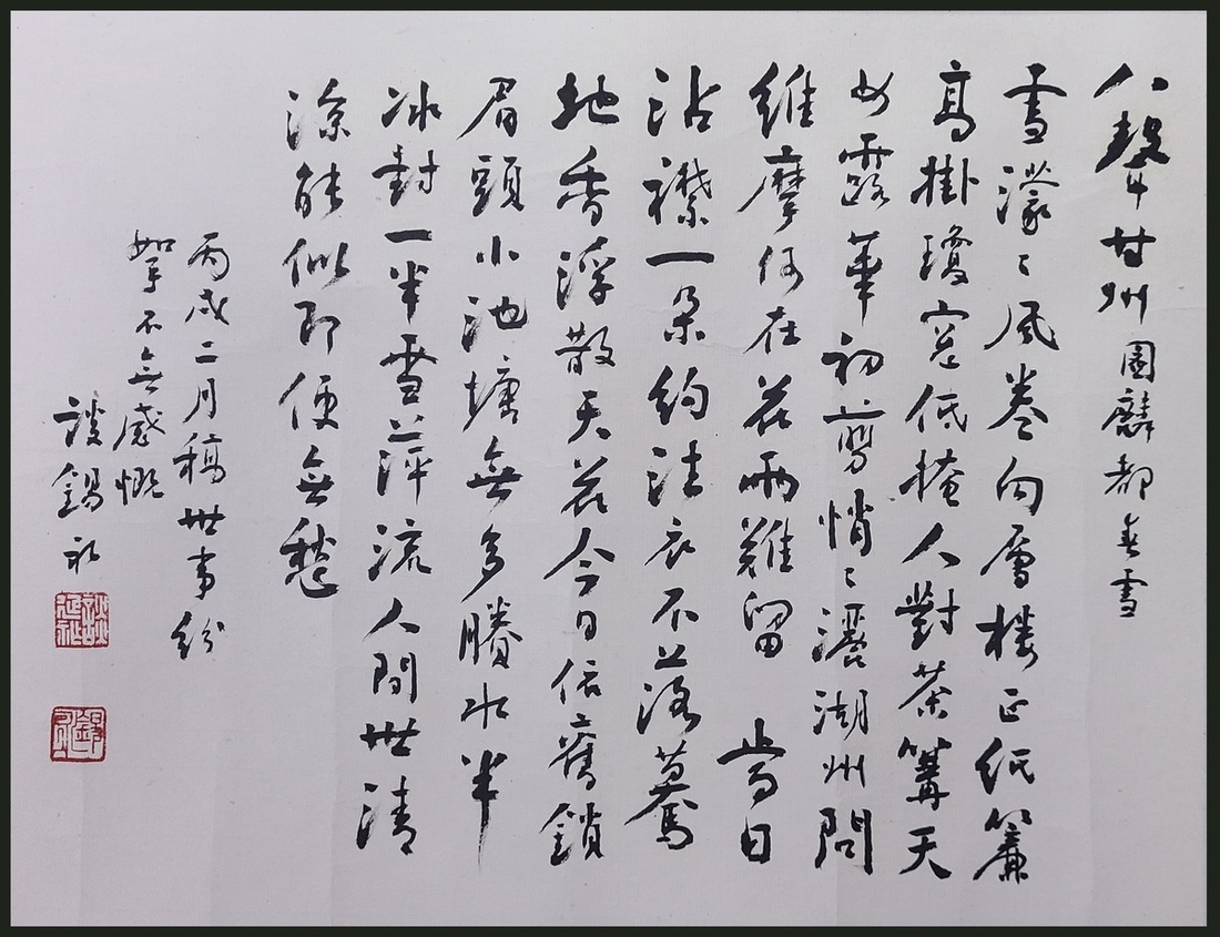 2006年談鍚永 (王亭之) 行書鏡面一幅. 題識: 丙戌二月稿世事紛挐不無感慨談鍚永. 鈐印两枚. 尺寸: 26X33.5CM