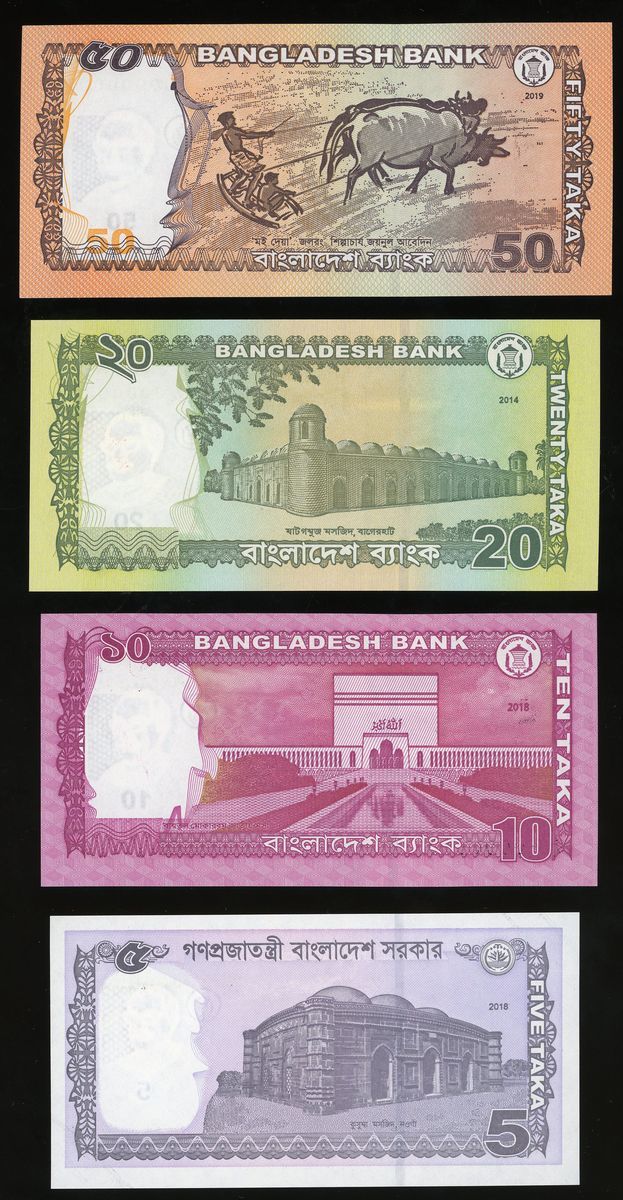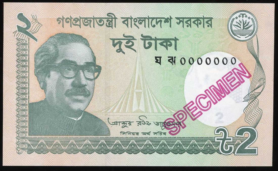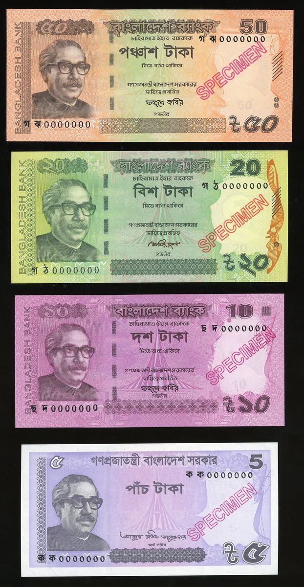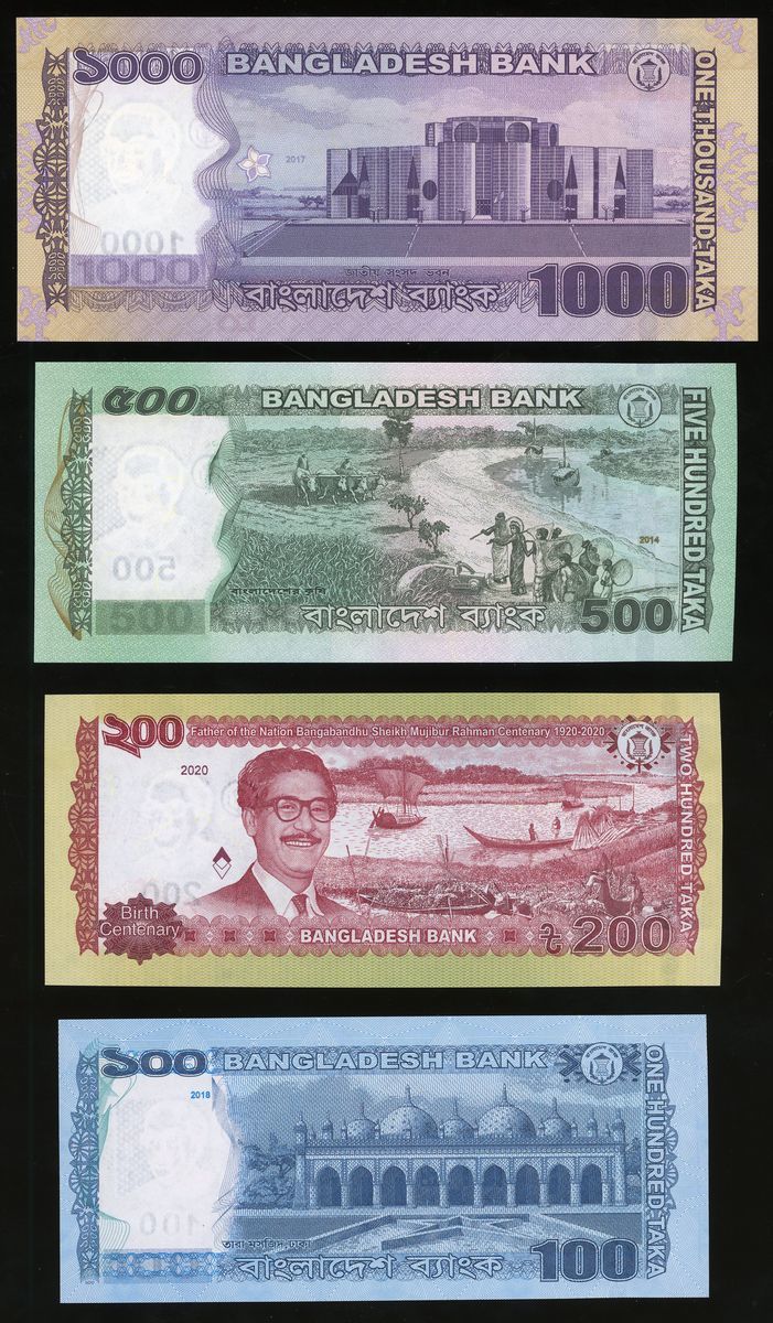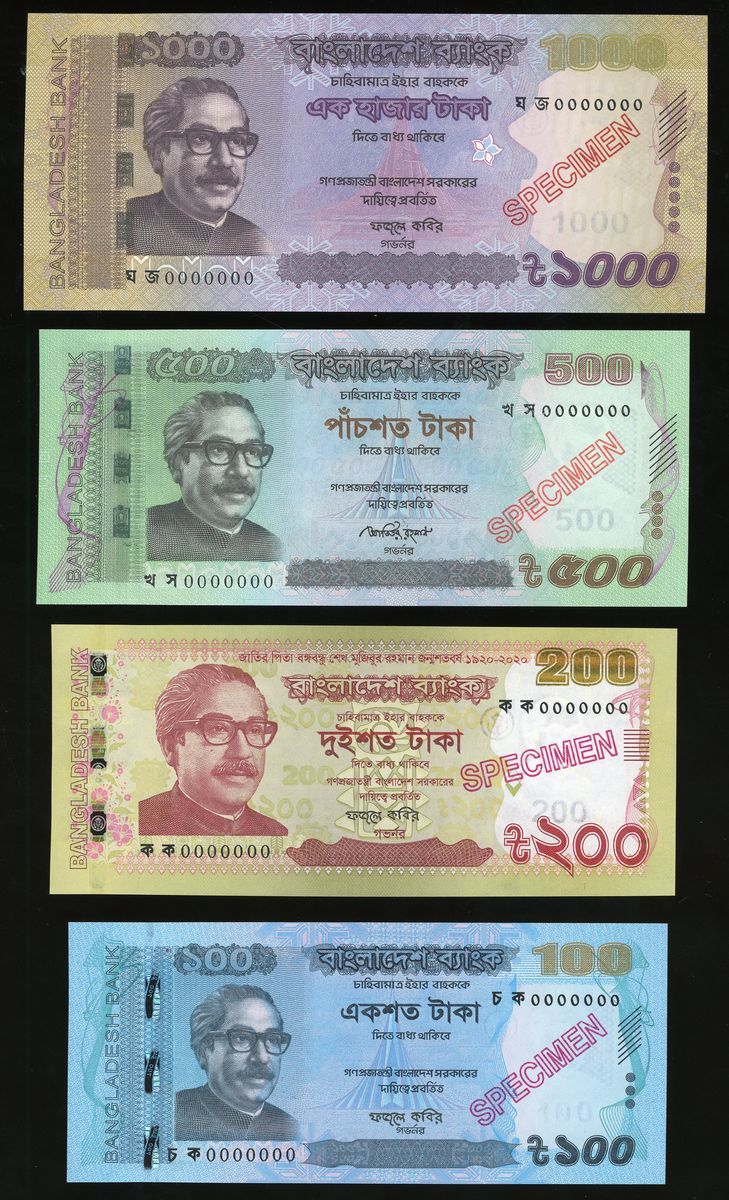 Bangladesh, specimen full set, 2014-21, including 2, 5, 10, 20, 50, 100, 200, 500 and 1000 taka, (Pick 52s, 64As, 54s, 55As, 57s, 58s 59s), uncirculated (9)