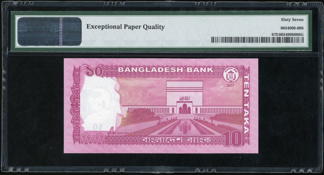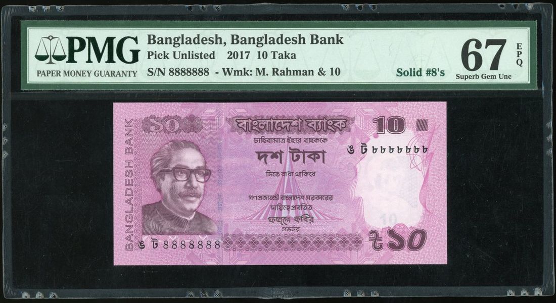 Bangladesh Bank, 10 taka, 2017, solid serial number 8888888, PMG 67EPQ Superb Gem Unc