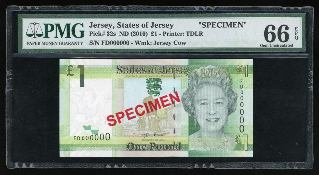 States of Jersey, specimen £1, ND(2010), serial number FD000000, (Pick 32s), PMG 66EPQ Gem Uncirculated.