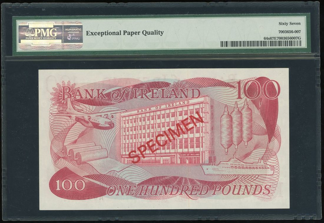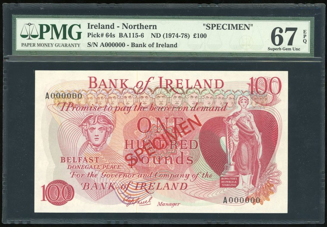 1974-78年愛爾蘭銀行100鎊樣票, 編號 A000000, PMG 67EPQ