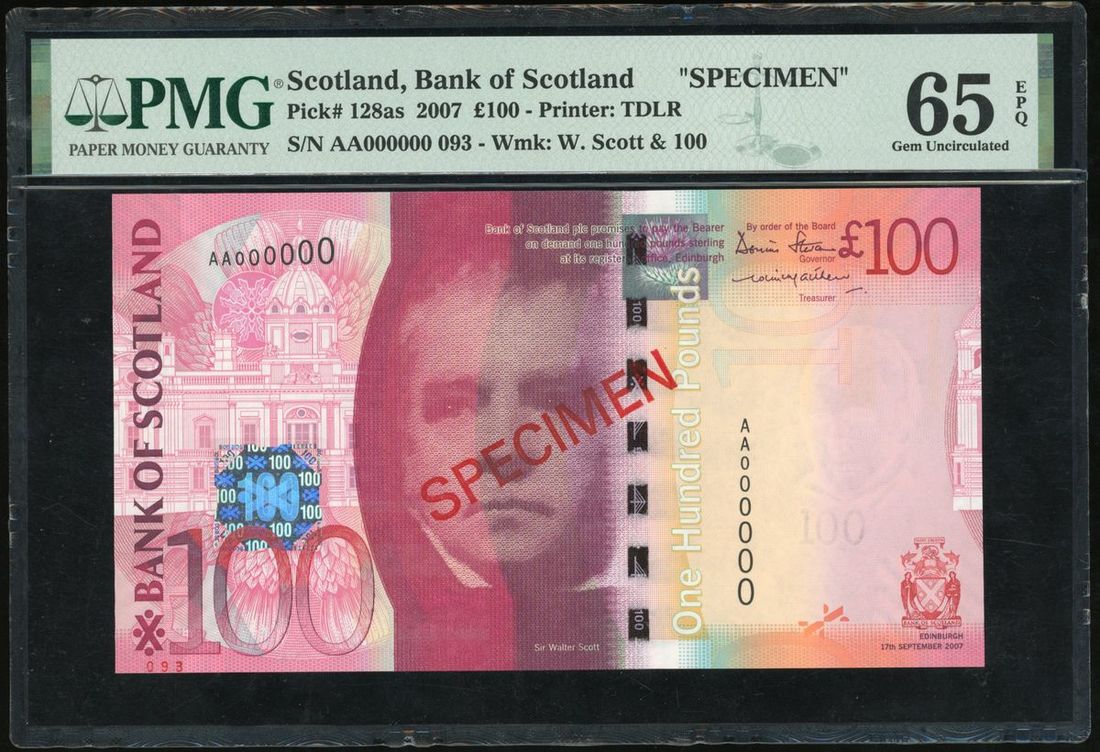 2007年蘇格蘭銀行100鎊樣票, 編號 AA000000 093, PMG 65EPQ