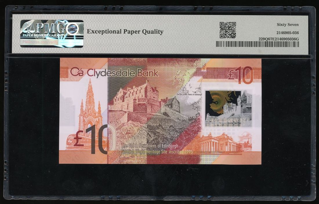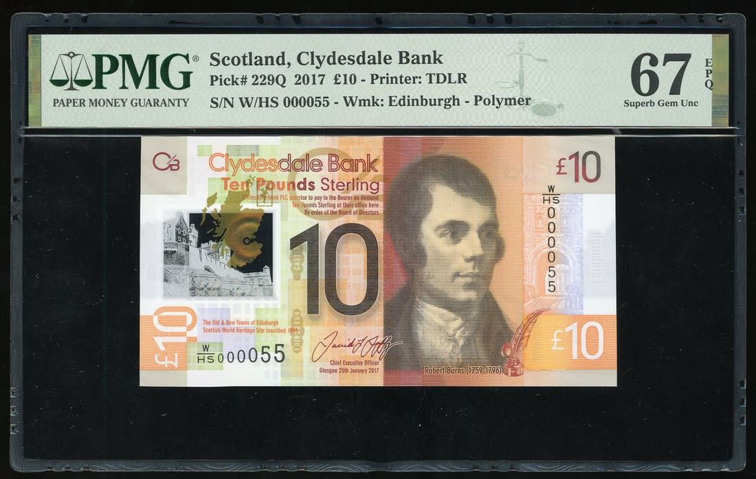 Clydesdale Bank, Scotland, polymer £10, 2017, serial number W/HS 000055, (Pick 229Q), PMG 67EPQ. Ex Charity Auction