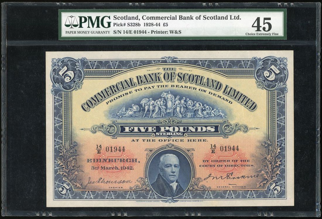 Commercial Bank of Scotland Limited, £5, 1942, serial number 14/E 01944, (Pick S328b), PMG 45 Choice Extremely Fine