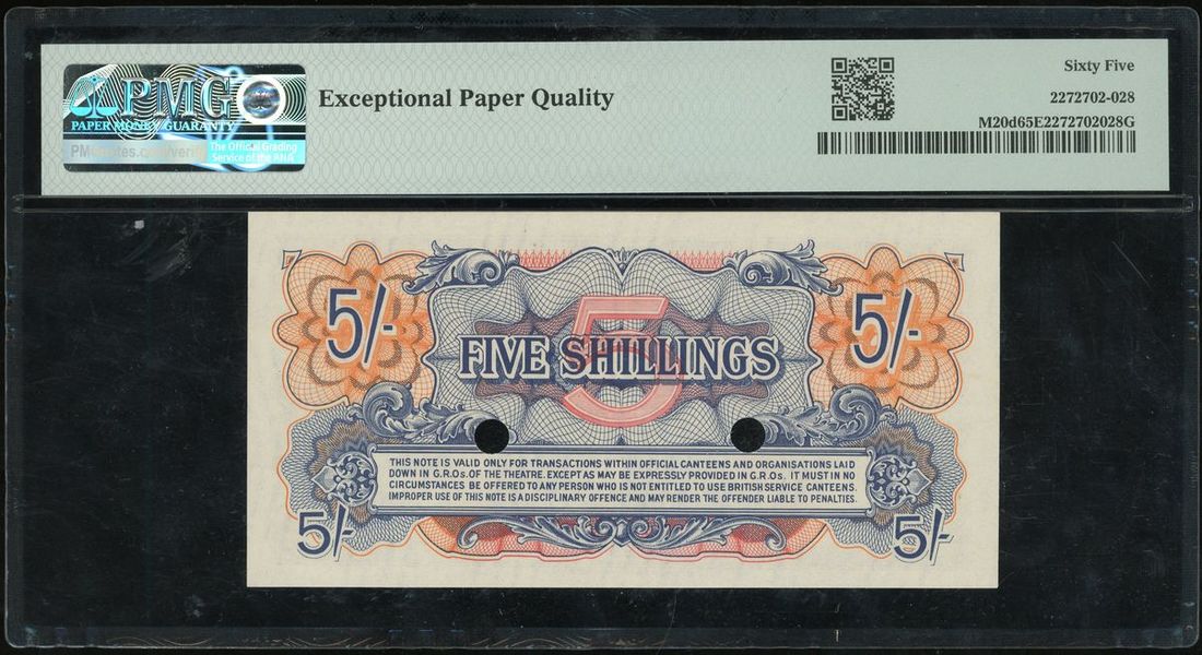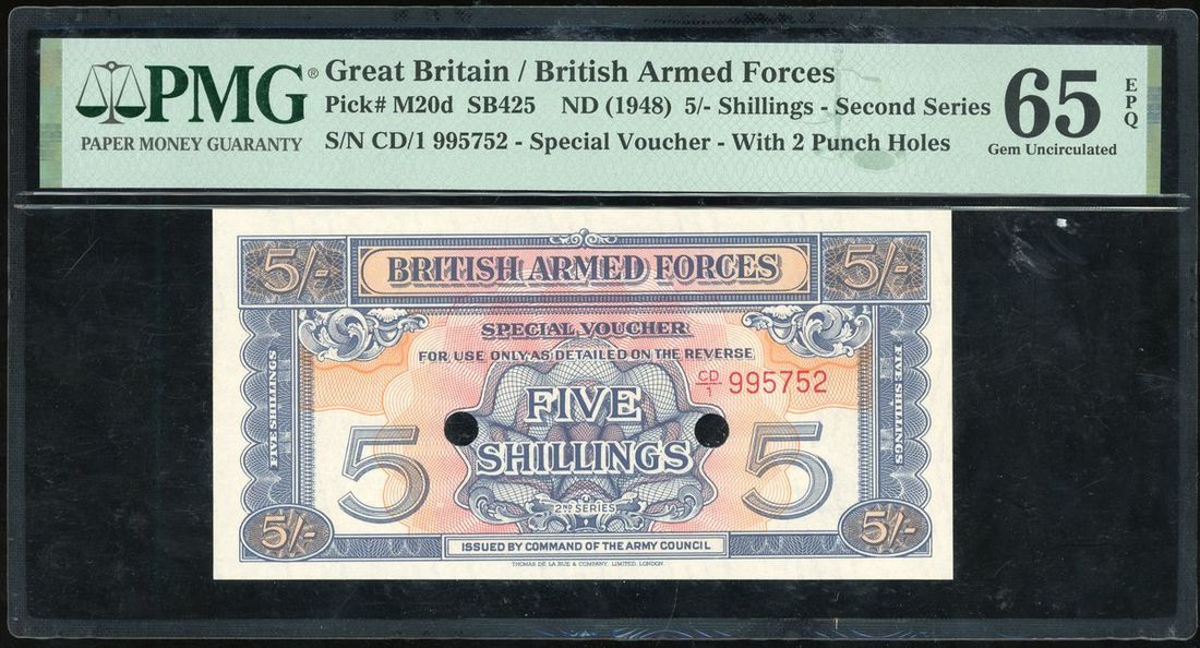 British Armed Forces, cancelled 5 shillings, ND (1948), serial number CD/1 995752, PMG 65EPQ