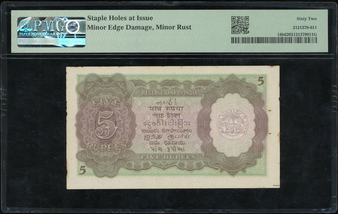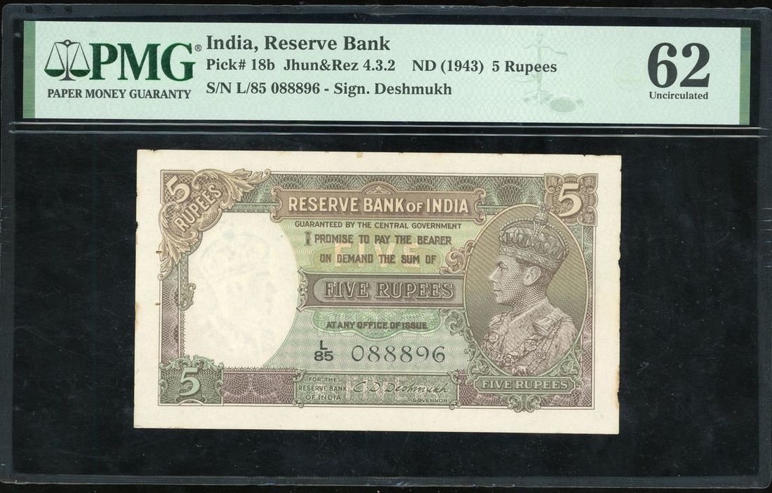 Reserve Bank of India, 5 rupees, ND (1943), serial number L/85 088896, (Pick 18b), PMG 62,minor edge damage, minor rust