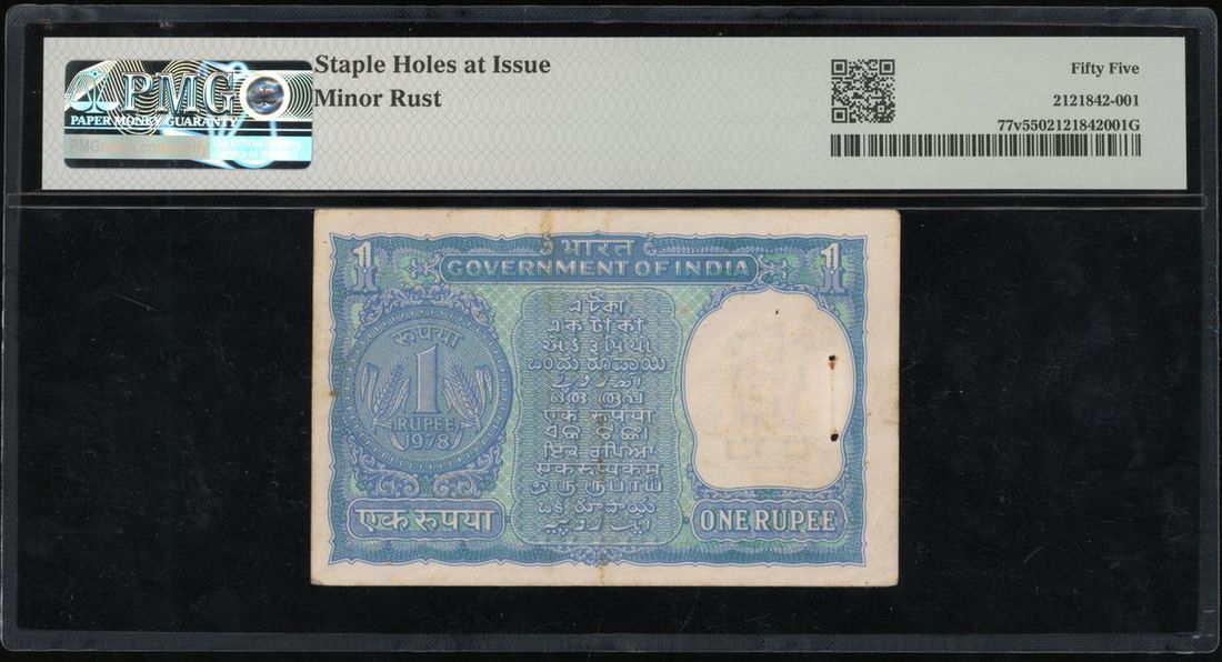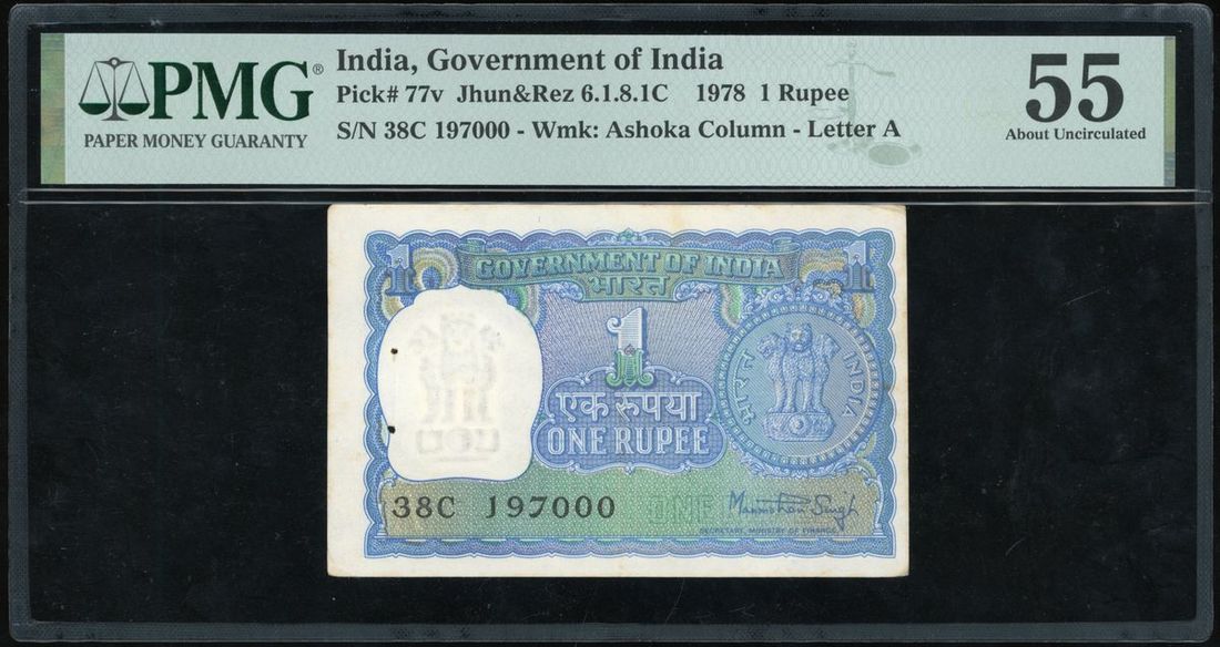 Government of India, 1 rupee, 1978, serial number 38C 197000, error colour print, green and blue, the normal one is purple,