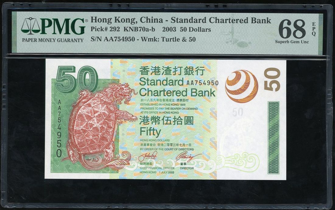 Standad Chartered Bank, China, $50, 2003, serial number AA754950, (Pick 292), PMG 68EPQ