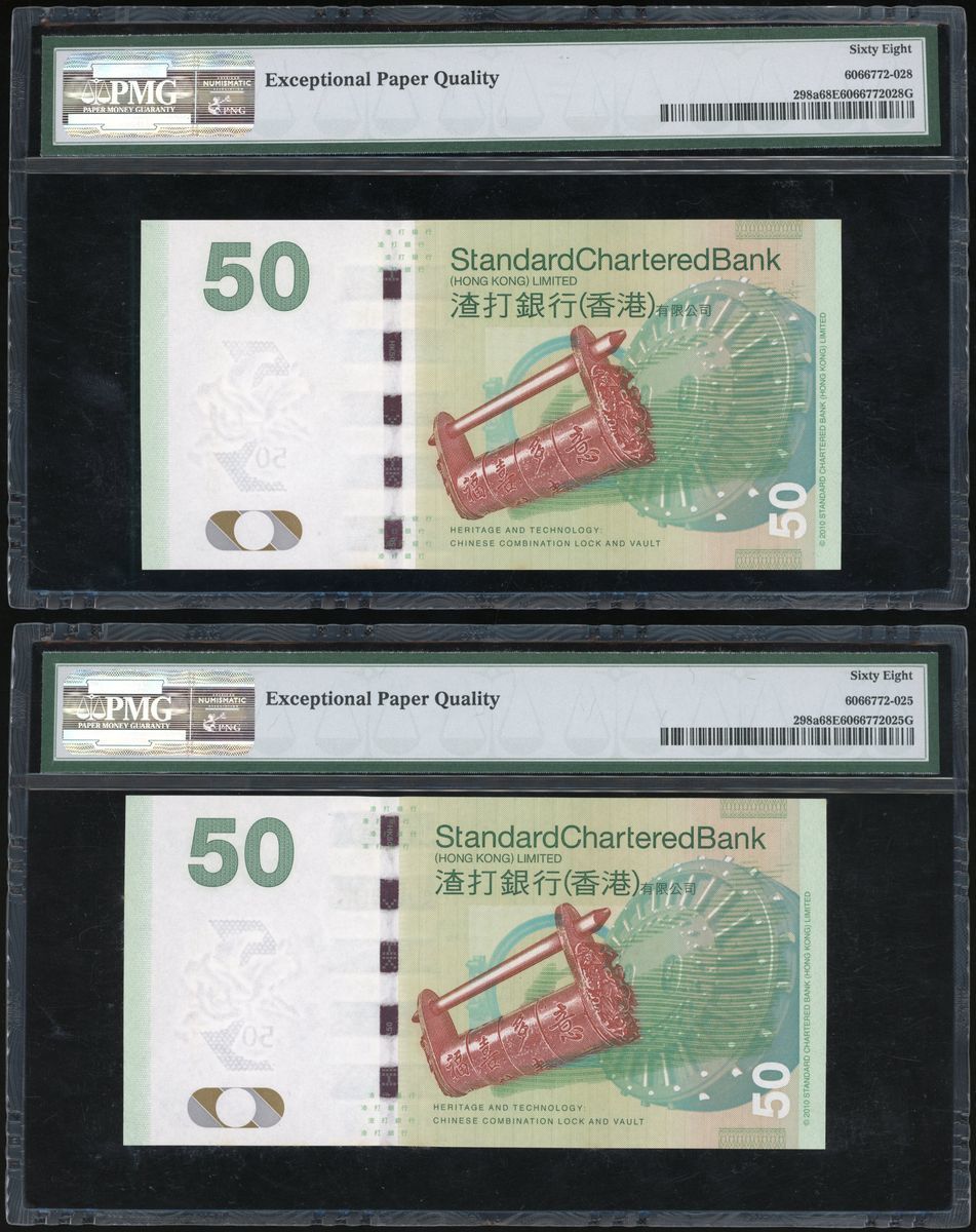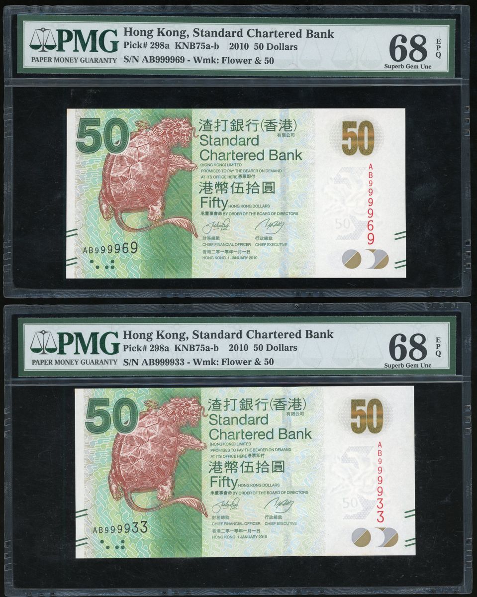 Standard Chartered Bank, Hong Kong, a pair of $50, 1.1.2010, fancy serial numbers AB999969 and AB999933, (Pick 298a), both graded PMG 68EPQ Superb Gem Uncirculated (2).