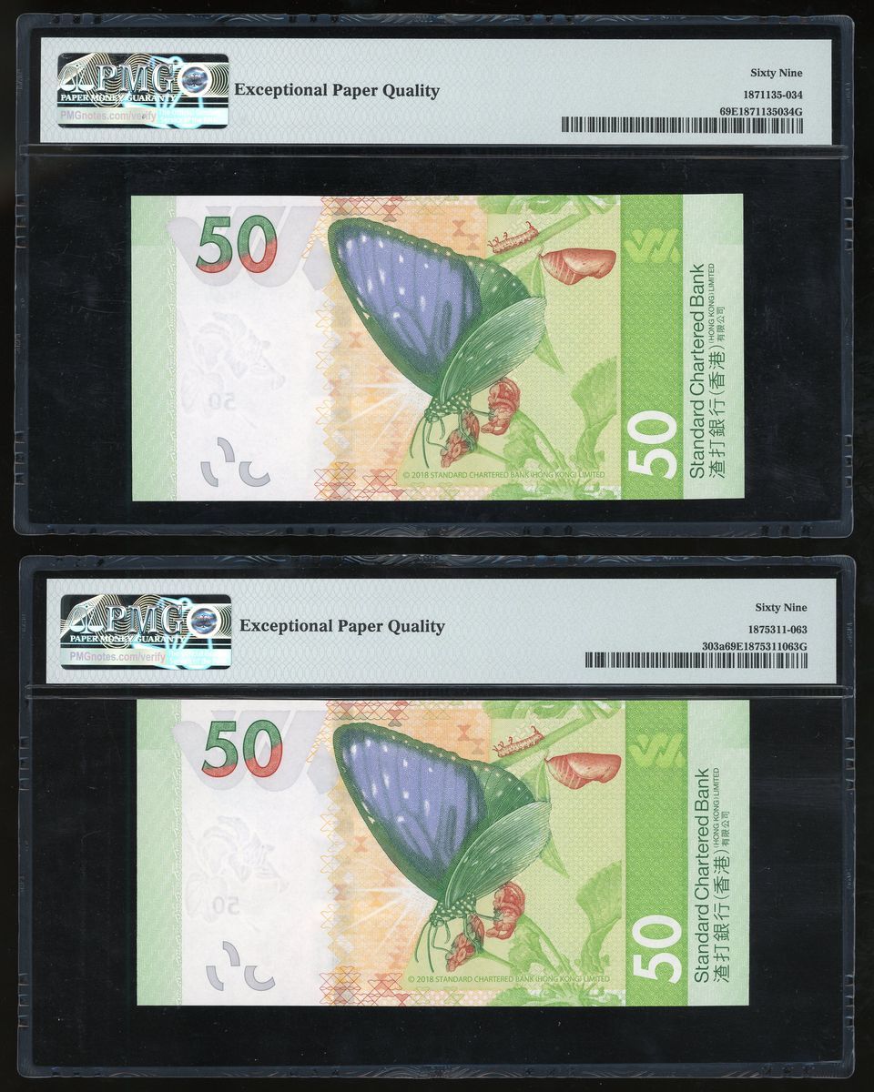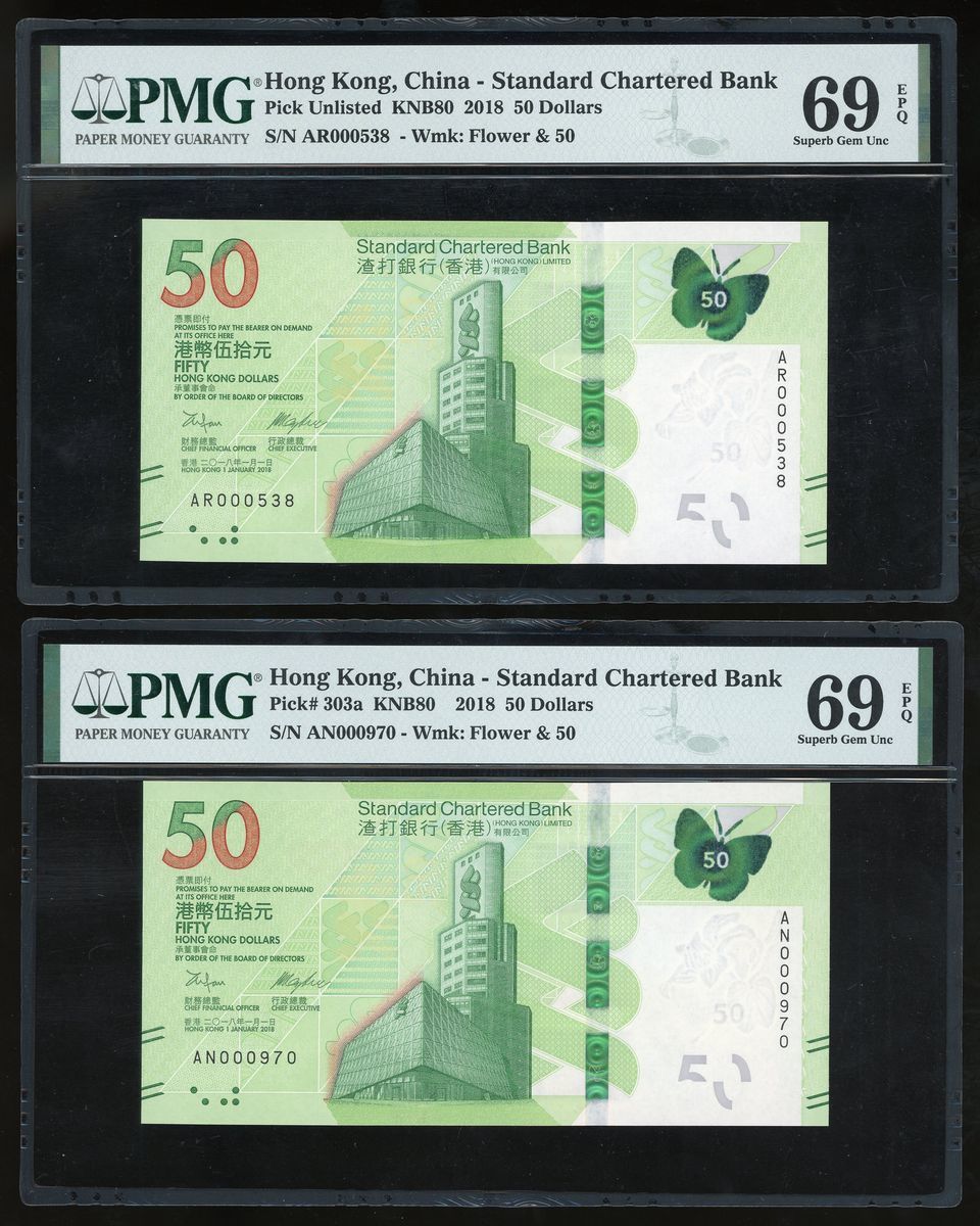 Standard Chartered Bank, Hong Kong, a pair of $50, 1.1.2018, serial numbers AN000970 and AR000538, (Pick 303a), both graded PMG 69EPQ Superb Gem Uncirculated (2)