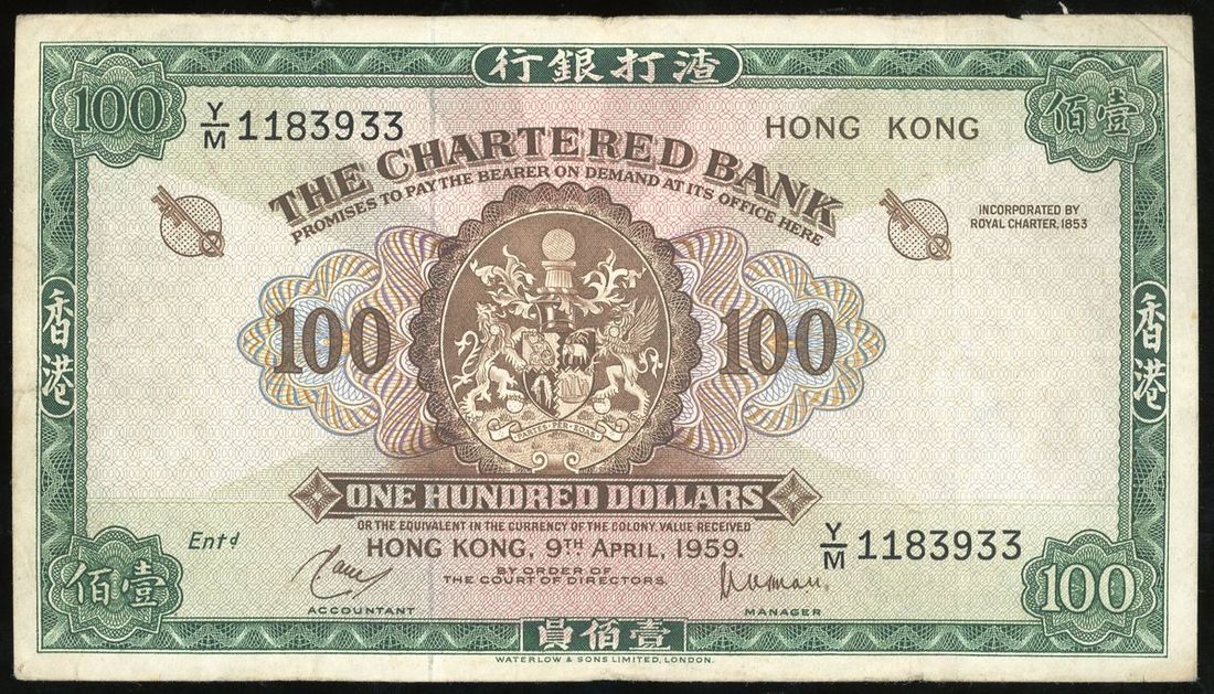 1959年渣打銀行壹佰員,編號Y/M 1183933,約VF品相