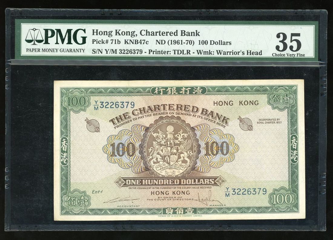 The Chartered Bank, Hong Kong, $100, ND(1961-70), serial number Y/M3226379, (Pick 71b), PMG 35.