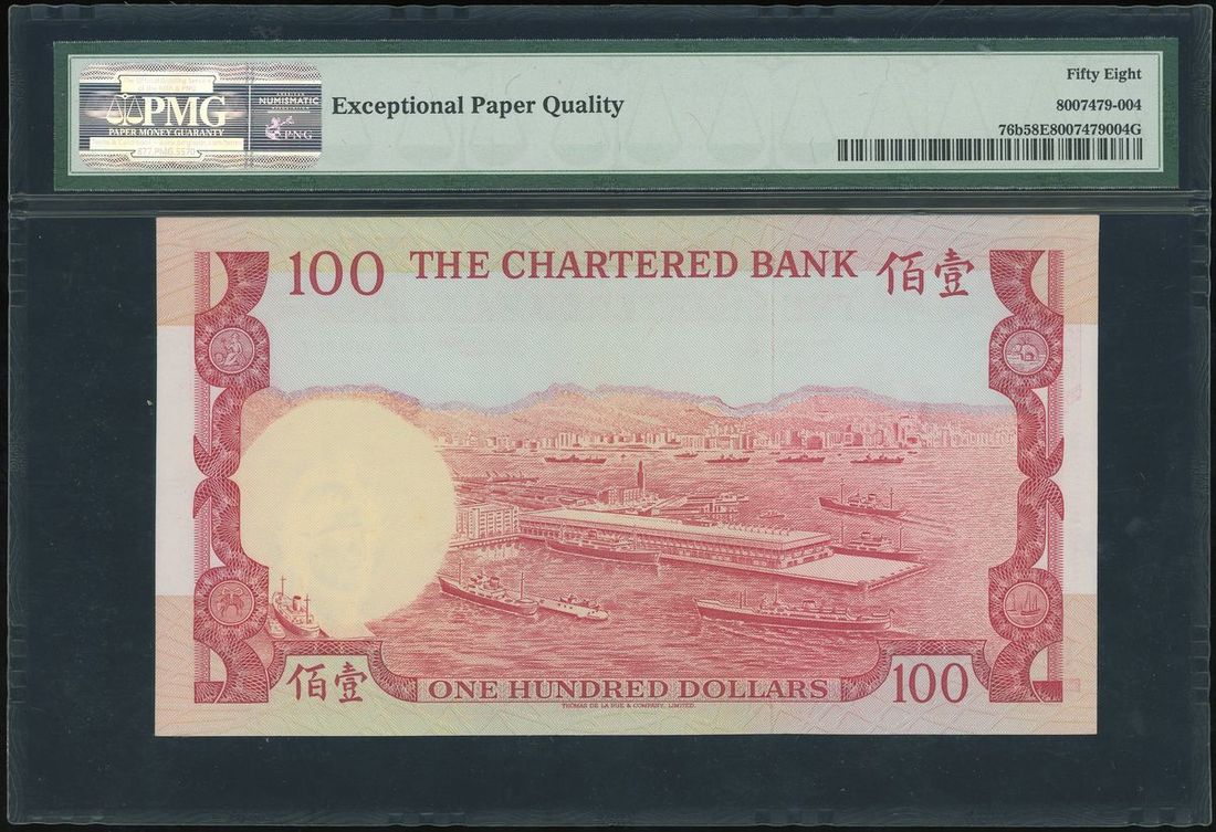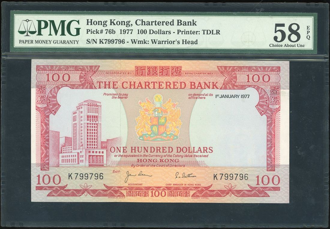 The Chartered Bank, Hong Kong, $100, 1.1.1977, serial number K799796, (Pick 76b), PMG 58EPQ Choice About Uncirculated