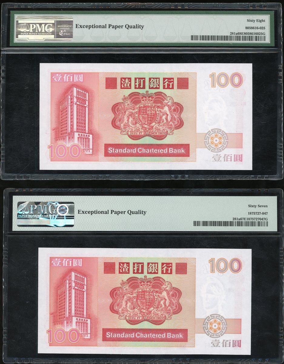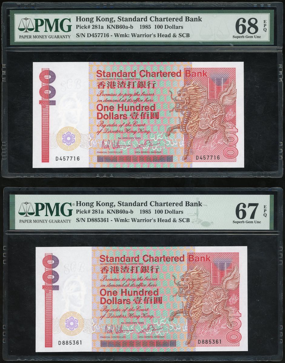Standard Chartered Bank, a pair of $100, 1985, serial number D457716 and D885361, (Pick 281a), PMG 67 and 68 EPQ.(2)